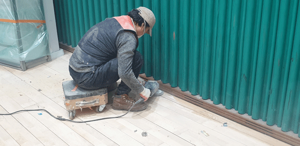 (분진가루 발생을 최소화 하기 위해 샌딩머신에 집진장치설치를 요한다.) - 06 마감청소 후 수용성 도료로 1회 도장한다. 도료가 건조된 후 슬림샌딩으로 표면을 매끄럽게 마감 샌딩한다.